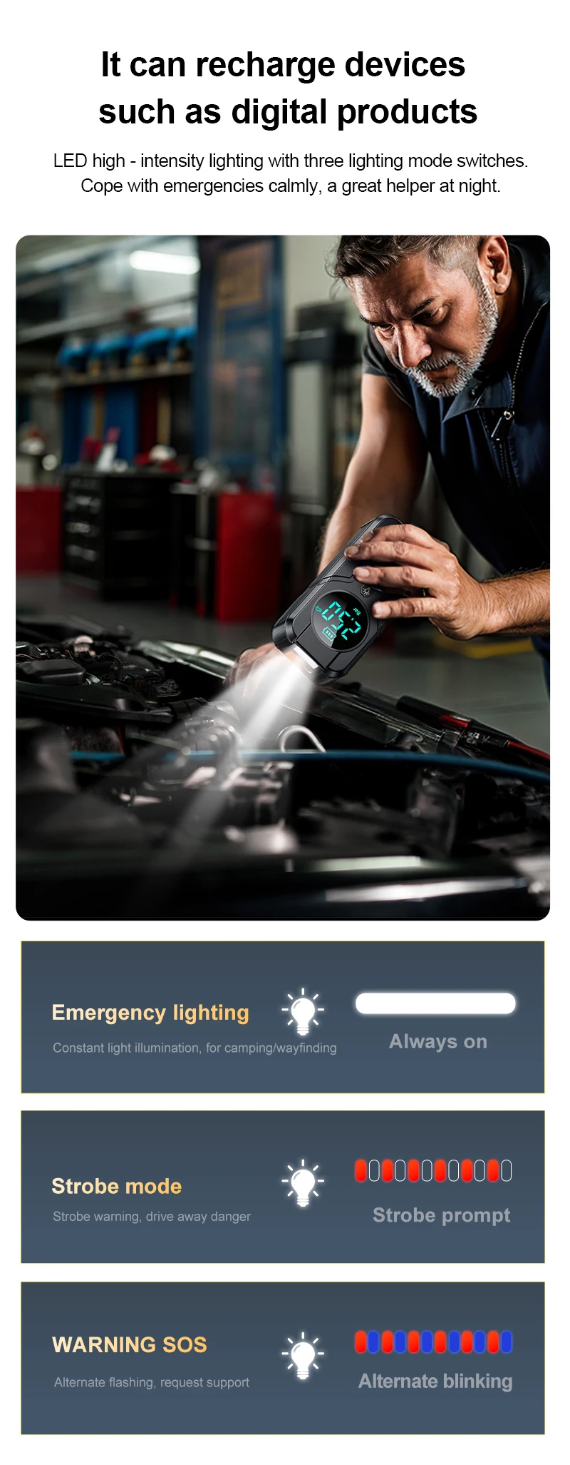 Product Name | 4 in 1 Portable Jump Starter Car Battery Booster Power Bank Charger Lithium Battery Pack Car Jump Starter Tire Inflator | ||||||