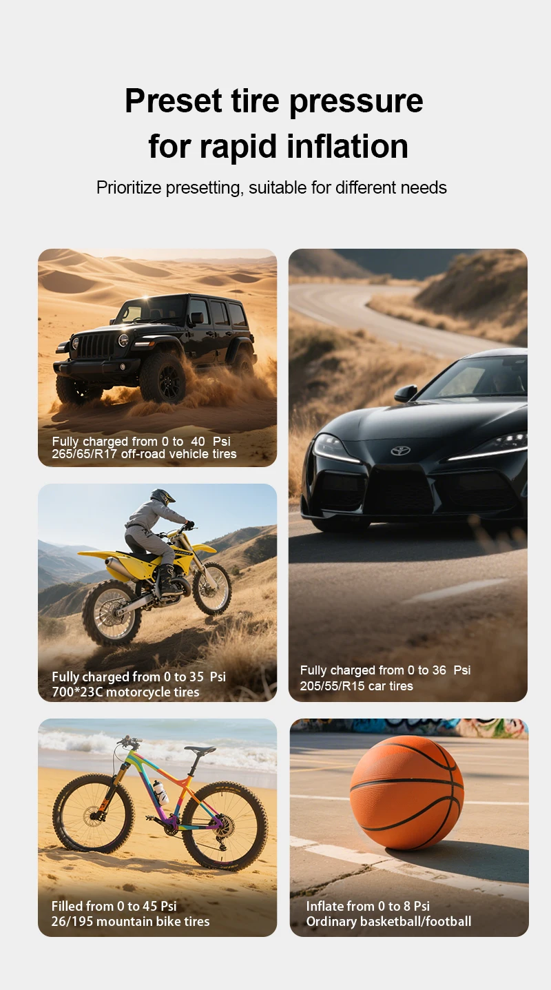 Function | inflation/lighting/pressure measurement/presettirepressure/burst/SOS/power bank/jumpstarter | ||||||