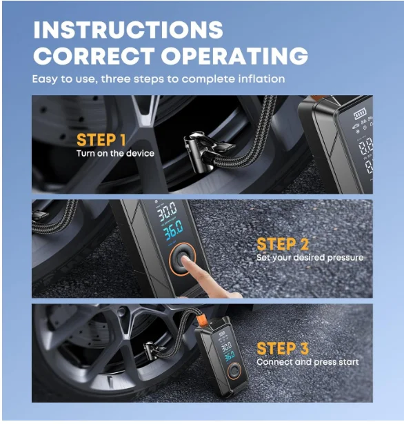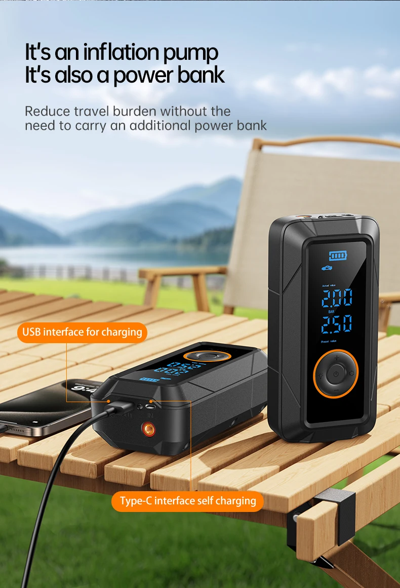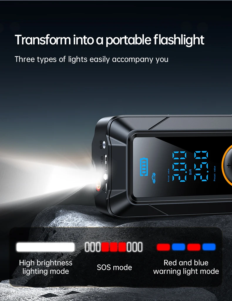 Functions | LCD Display 4000mah power bank. SOS flash led light. air pump car tire inflator | ||||||