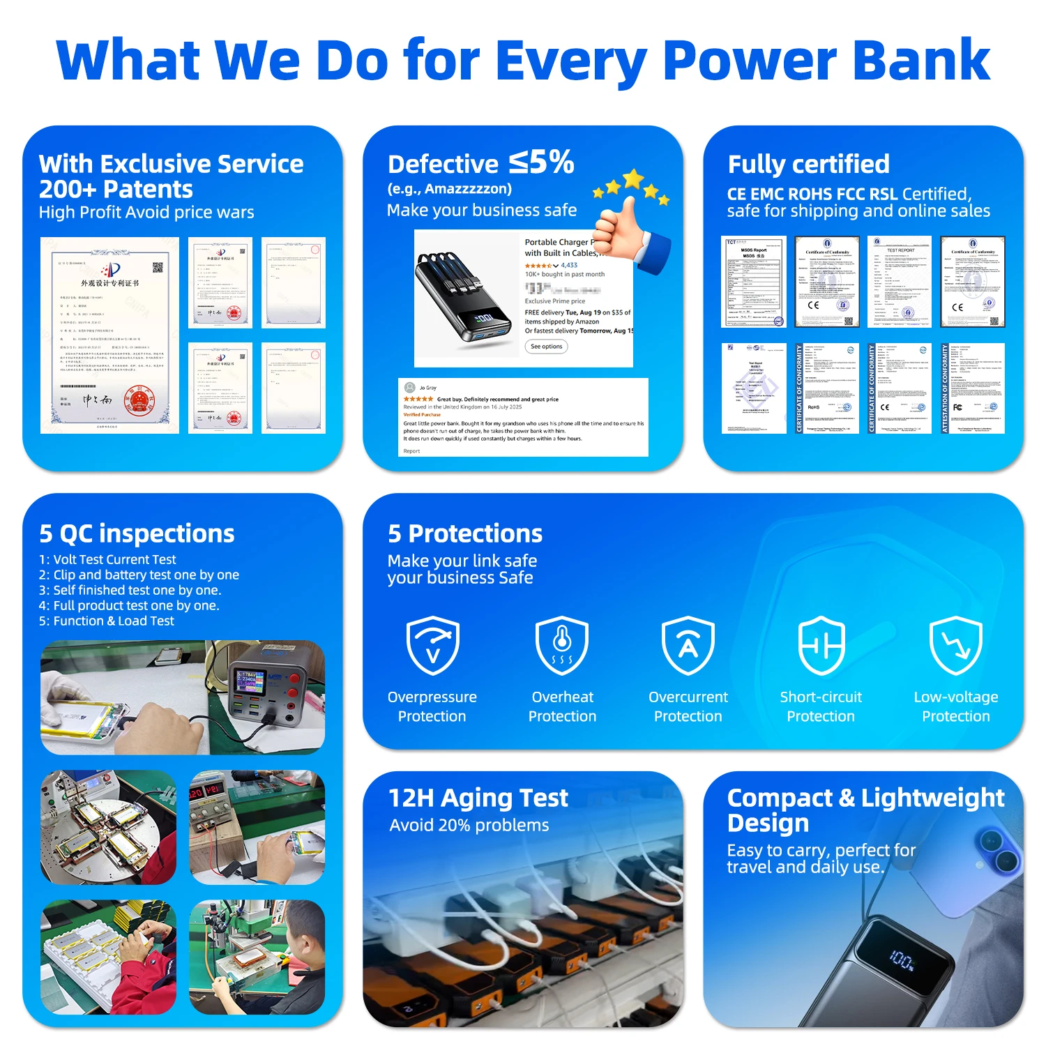 Factory Background & Certifications:Shenzhen Shengyi Technology Limited, established in 2010, with a factory located in Dongguan, is BSCI and ISO certified.We have 46 injection molding machines and 10 aging test machines, capable of testing 10,000 units at a time to ensure high product quality.Production Capacity:Our factory spans 15,000 square meters with 500 employees, equipped with our own mold factory and 10 industrial design (ID) designers.We offer strong OEM and ODM capabilities with a fast mold development time of only 25 days.Quality Control & After-Sales Service:We conduct 5 rounds of QC checks throughout the production process, ensuring rigorous quality control at every stage.All products undergo 100% quality inspection before shipment.We offer 24-hour aging tests to ensure product durability and performance. All products come with a 12-month warranty and lifetime after-sales service.E-commerce Support & Custom Services:We have helped over 80% of Amazon sellers and Mercado Libre sellers with a defective rate of less than 5%, enabling them to reach the TOP 10 in their industries.We provide complete e-commerce platform sales images and video design services to help customers boost their online sales, with nearly 30 clients achieving sales from 0 to TOP 3.Patented Products & Exclusive Distribution:We hold over 300 patented products, offering exclusive distribution and independent agency options. This ensures that our customers avoid the risks of product homogeneity and price wars on e-commerce platforms.By working with us, clients can maintain a competitive edge with unique products.Certifications & Battery Technology:Our products are CE, FCC, ROHS, PSE, UL, MSDS, and UN38.3 certified.We use branded battery cells, ensuring top-tier battery performance and safety.Fast Delivery & Flexible Cooperation:No minimum order quantity (MOQ) restrictions, wit